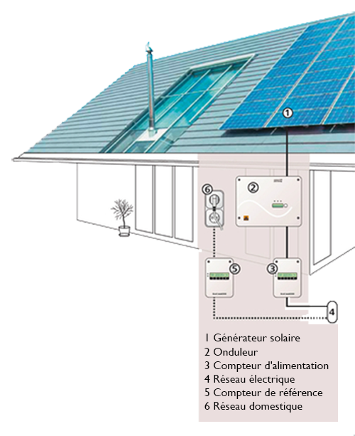 Les modules solaires installés sur le toit produisent de l’électricité. L’onduleur transforme le courant continu solaire en courant alternatif.
